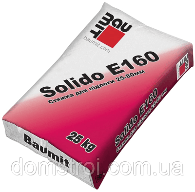 Стяжка Baumit Solido E160 призначена для влаштування стяжок підлоги по жорстких пов'язаних підставах, розподільному, теплоізоляційному шарах, в тому числі для підлог з підігрівом. Суміш придатна для використання в якості підготовки на терасах і балконах, за умови подальшого нанесення гідроізоляції. Підходить для ручного і механізованого нанесення всередині і зовні будівель. Рекомендована товщина шару 25-80 мм.