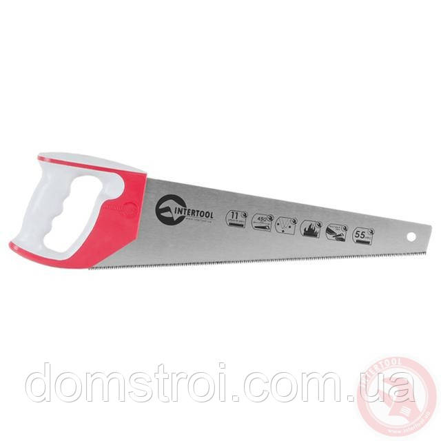 Ножівка для дерева INTERTOOL HT-3162 виготовлена з високоякісної сталі твердістю 55 HRC. Щільне потовщене полотно забезпечує підвищену точність пиляння. Довжина робочої поверхні — 450 мм. Калені зубці (11 зубців x 1 дюйм) особливої форми з потрійним заточуванням забезпечують швидке різання в обидві сторони — як уперед, так і на себе. Ножівка обладнана зручною ручкою з високоміцного пластику з накладками з термопластичної гуми. Форма ручки дає змогу відкладати кути 45° і 90°. Така ножівка чудово підійде для поперечного розпилювання дощок і брусків, матеріалів із фанери, ДВП, ДСП, плінтусів, найкращиків та ін.
